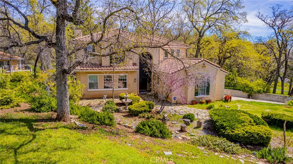 Two beautiful custom-built homes on 2.49+/- acres located in the Sierra Highlands. Sierra Highlands has a Firewise Certificate to help with your insurance costs. The first home is a 2 story, Mediterranean style, stucco with a tile roof. Upon entering you will find a formal living and dining room, a family room with a pellet stove, both areas open to the kitchen which features white cabinets, tile counters, center island and a walk-in pantry , 1 bedroom, bathroom, office, and laundry room complete the main level. Upstairs highlights laminate flooring, a master suite with a fireplace and a private deck, a huge bathroom with double sinks, separate soaking tub and walk-in shower and closet, adjacent to the master is a Junior Suite with a private bath. There is a gated garden in the front of the home, perfect place to relax. The second stucco home, built in 2017, is approximately 1,000 sq. ft. (not included in above sq footage), 2 bedroom, 2 bath, open floor plan with a fireplace, inside laundry, includes a raised deck off the living area. The master suite has a walk-in shower stall. Both homes have recessed lighting, abundant windows for natural light. Plenty of room for RV or boat parking and includes 2 storage sheds. The homes are on 1 parcel with separate addresses.