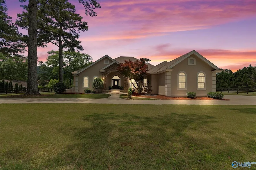 Custom built home on 4.6 incredible acres truly does have it all! The main home and guest house ( could be rental) has their own gated entrances- Extensive landscaping, crown molding throughout main home, laundry room is reinforced can serve as a safe room, stocked spring fed pond, pavillion, covered rv parking, fire pits, retractable screened back porch entertainment area w/ infrared heaters and dual fans, primary suite with sitting area, oversized glam bathroom, office can serve as 4th bedroom, guest house has 2 bedrooms, laundry, living space, kitchen, 2 car garage, New HVAC, extensive landscaping, stables, 15 min to Huntsville, 20 Min to Lake Guntersville- not that you would ever leave..