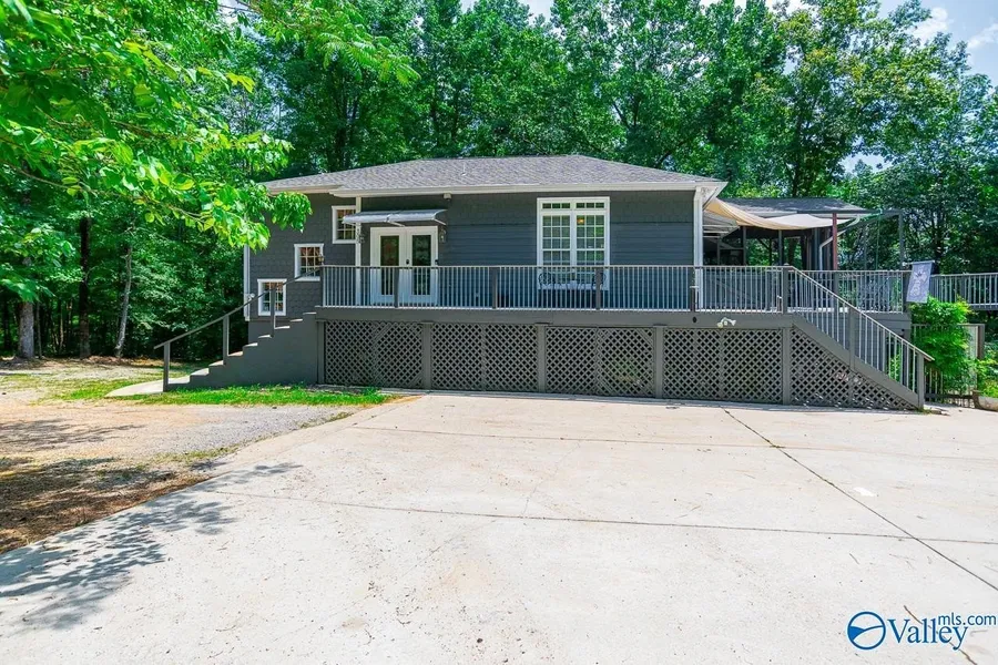 Only 20 minutes from Huntsville. Want a secluded place in the woods by a lake with lake access? Custom built main house geared for entertaining and family living with 10 foot ceilings on the main level, and 9 1/2 on lower level. 3 bedroom, 3 1/2 bathroom, (two with walk-in showers), along with large gathering spaces. Inside: New Granite countertops in the kitchen, freshly painted interior, new 80 gallon hybrid water heater. 300 amp service. Primary suite on lower lever includes an office/art studio. Outside: Enjoy a screened porch, deck, pizza oven and gazebo in a quiet setting. Detached office or apartment, connected by a catwalk. Separate storage building perfect for UTV’s.