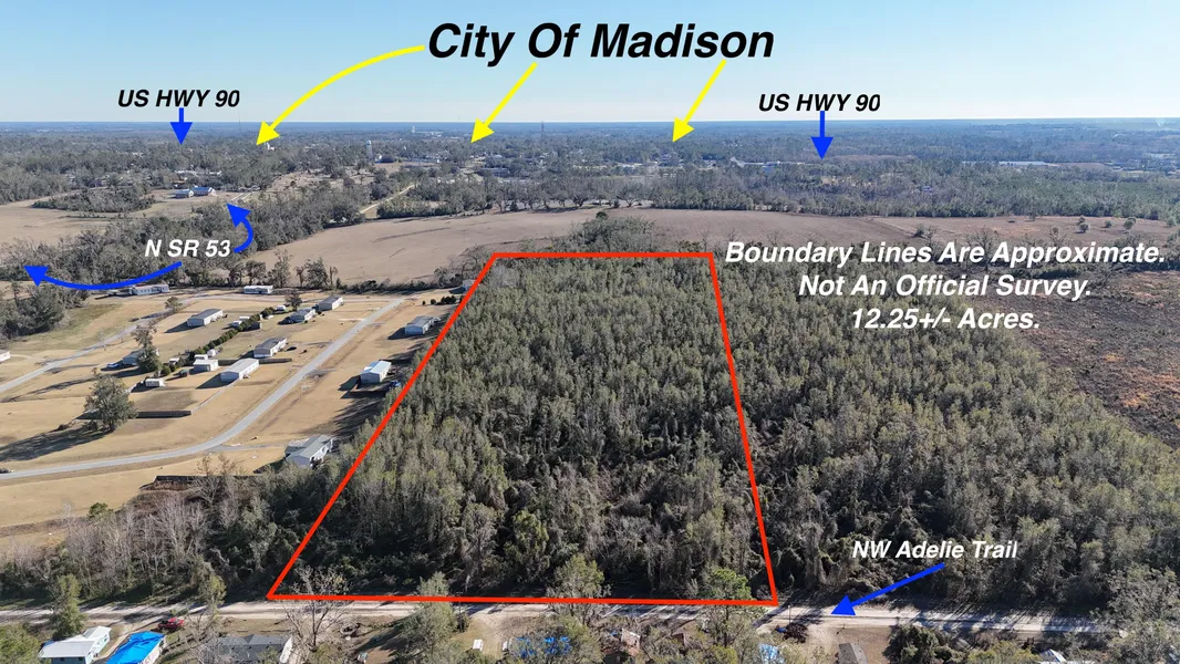 Check out this fantastic 12.25+/- acre tract just minutes from downtown Madison, FL! Property has just been surveyed! This beautiful piece of land is heavily wooded with some nice Florida hardwoods! This would make an excellent hunting/recreational property! Wildlife such as whitetail deer, wild turkey, and small game frequent the area. If hunting is not your thing this would make a phenomenal homesite! Build your dream home, or put your new manufactured/mobile home on the land! Clear the land exactly how you see fit, and leave the rest for privacy! Enjoy all the perks of country living while literally being just minutes from downtown Madison, FL for all your everyday conveniences! The land is completely high and dry! No flood zone, or wetlands. No restrictions, or HOA. The property is located on a county maintained dirt road less than a minute from paved SR 53. This tract features 420+/- feet of frontage on NW Adelie Trail. Hwy 90 is just minutes away! Interstate 10 is nearby for easy commuting east and west. This parcel also has great potential for investors! Further subdividing, and development may be possible with proper approval from the county. Graceland Estates is right next door. North Florida College is in very close proximity to the land. There are numerous nearby attractions in this part of North Florida to enjoy such as renowned Madison Blue Spring State Park, Twin Rivers State Forest, the Withlacoochee River, the Suwannee River, Cherry Lake, etc. Madison, FL is literally minutes away! Valdosta, GA is about 35 minutes away! Tallahassee, FL, the State Capital is only an hour away! The Gulf of Mexico is just over an hour away! THERE IS AN ADDITIONAL ADJOINING 12.25+/- ACRES AVAILABLE FOR A TOTAL OF APPROXIMATELY 25+/- ACRES. THERE ARE TWO 12.25+/- ACRE PARCELS AVAILABLE EACH LISTED FOR $104,125. THIS LISTING CONTAINS PHOTOS OF BOTH PARCELS. BOTH PARCEL 1 AND PARCEL 2. IF YOU'RE ONLY INTERESTED IN ONE PLEASE SPECIFY WHICH PARCEL YOU ARE INTERESTED IN. Call Jerrod Trainer at 850-869-9872 if you're interested in purchasing.