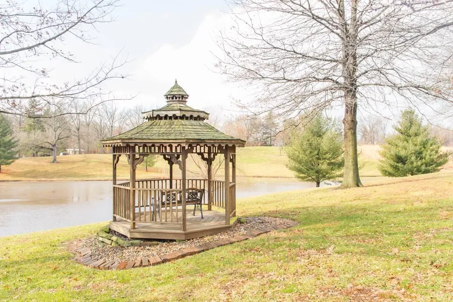 As you approach the property, the driveway entrance pillars and long curved driveway lined with eloquent lighting welcome you home. The cozy front porch is constructed of maintenance free decking with plenty of shaded area to sit and enjoy the view of the 1.5 acre well stocked lake shaped like the State of Illinois, and featuring the American flag on a 30? flagpole. There is a beautiful gazebo and a couple of park benches to enjoy the lovely lake from as well.