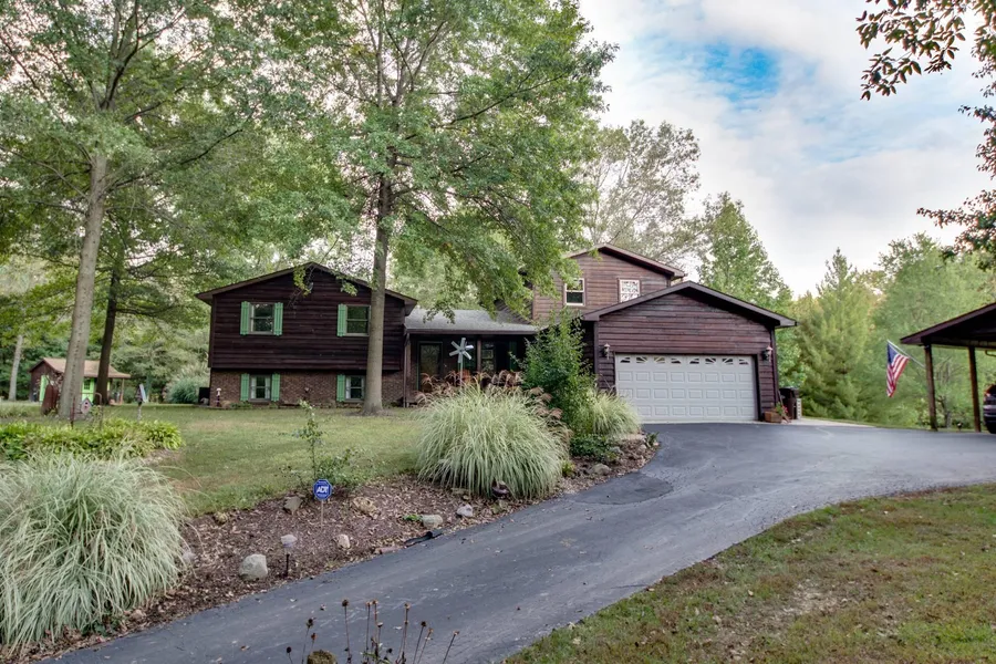Remarkable!!! A property like this does not come available often! The home features 4 bedrooms, 5 bathrooms, tons of space inside and out, a large master bedroom suite with a gorgeous view of the lake, an updated family room in the basement, an open kitchen concept, a large dining room with built in shelves, updated bathrooms, a large living room with a gas fireplace and wet bar, an 18 x 32 deck, and a 12 x 15 screened porch. The property is situated on 8.9+/- wooded acres with a stocked 1+/- acre pond and dock, several riding trails, a 26 x 64 detached garage/work shop, a beautiful garden shed with water and electric, very well manicured landscaping and and abundance of nature. All of this located within minutes of the amenities of town and Interstate 255. This property will melt your heart, so don't miss an opportunity to see it for yourself!