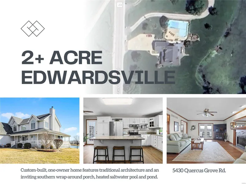 Experience serene living on a pristine 2.38-acre lot in Edwardsville. This custom-built, one-owner home features traditional architecture and an inviting southern wrap-around porch. Inside, a spacious foyer with a vaulted ceiling and luxury vinyl flooring leads to a sunlit living area adorned with crown molding and a fireplace. Beyond the atrium glass doors lies your private backyard oasis: a screened-in deck, heated saltwater pool, lounging patio, and stone pathways. The gourmet kitchen boasts Cambria quartz countertops and custom cabinetry, framing picturesque views of the tranquil pond and stone firepit. Additional entertainment areas include a lower-level game area and a family room. The upper level features a secluded primary suite with French door entry and elegant arched window, complemented by three additional well-appointed bedrooms with ample storage. Thoughtful design elements...