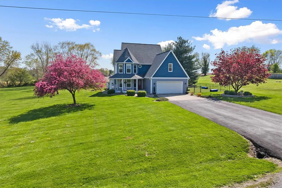 Nestled on 2 acres adorned w flowering trees & peaceful views, charming 2-story home blends spacious living w the beauty of rural life. Step inside to a large open entryway that flows seamlessly into the living room, dining area, & kitchen. Perfect for entertaining or enjoying cozy evenings at home. The natural light pours through the windows, highlighting the open-concept layout & offering inviting views of the surrounding landscape. Upstairs, you'll find three comfortable bedrooms, including a spacious primary suite that features its own private bathroom & bonus area, ideal for a nursery, home office, or the walk-in closet of your dreams. Step outside & enjoy the outdoor amenities this home has too offer: a fenced-in area w pet-friendly AstroTurf, an above-ground pool just off the back deck for warm-weather fun, & a 2nd large garage with an additional carport tucked at the rear of prop...