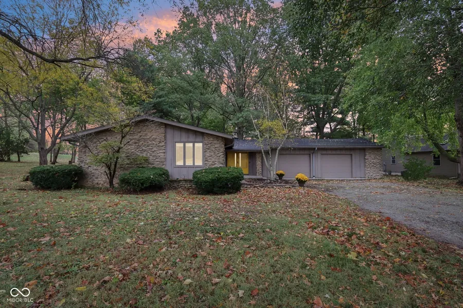 Set on a serene 1.12-acre lot spanning two parcels, this stunning custom mid-century modern all-limestone ranch blends timeless architecture with peaceful country living. Overlooking a tranquil pond next door and surrounded by mature landscape, the property offers both privacy and convenience-just minutes from Pendleton schools and area amenities. Inside, you'll find three spacious bedrooms and two full baths, thoughtfully designed to capture natural light through multiple skylights. The galley-style kitchen sits at the heart of the home, connecting seamlessly to the surrounding living spaces. The inviting family room features a cozy wood-burning fireplace, creating a warm and welcoming focal point for gatherings. A rare indoor atrium spans the entire width of the back of the home-an absolute dream for plant enthusiasts or anyone who loves bringing the outdoors in. Step outside to a large deck overlooking the fenced backyard, ideal for entertaining or enjoying quiet evenings by the water. The three-car garage includes a convenient pull-through overhead door, making backyard access and projects effortless. If you're seeking mid-century charm, natural beauty, and everyday functionality, this exceptional limestone ranch delivers it all.