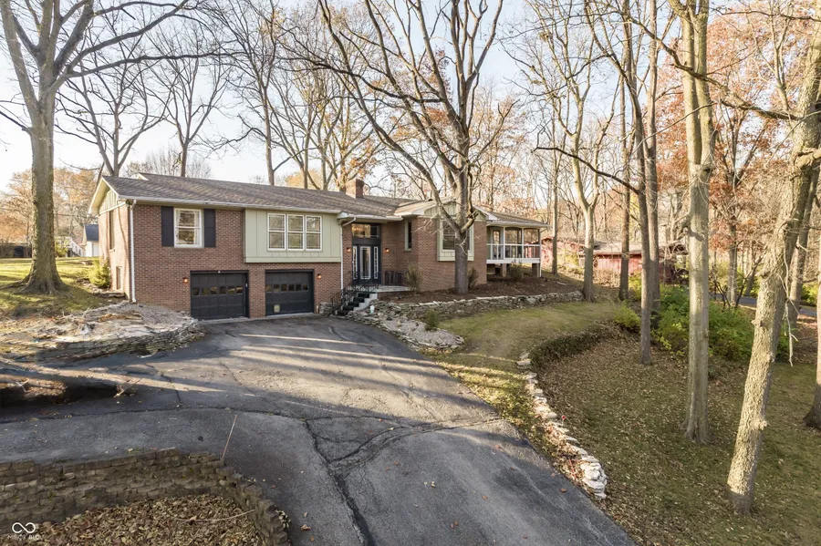 This beautifully updated 4-bedroom, 4-bath mid-century modern home offers 2,723 finished square feet plus a stylishly finished basement on a serene 0.64-acre wooded lot, combining timeless architecture with warm modern finishes throughout. The striking brick-and-board exterior, two garage bays, terraced stone landscaping create impressive curb appeal, while the interior features a coffered-ceiling living room with custom trim and fireplace, a bold and inviting dining room, and a bright granite-and-stainless kitchen with abundant cabinetry and a center island. The private primary suite provides direct access to the screened-in porch, with additional en-suite and guest bedrooms and beautifully refreshed bathrooms including a dramatic black-and-white soaking-tub suite with integrated laundry. The expansive screened porch and rear patio overlook the mature wooded yard, complete with a charming storage shed and plenty of open space for outdoor living, while the finished basement serves as a true entertainment hub, perfect for hosting or unwinding-making this home an exceptional blend of character, sophistication, and modern comfort in a peaceful, tree-lined setting. For practical peace of mind, this winter will be no challenge as the furnace is only one year old. Additionally the dishwasher and laundry washer are both only 1 year old as well. Total serenity awaits!