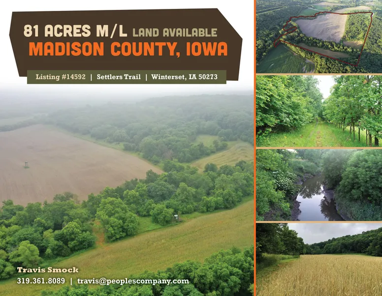 Madison County land offering that truly has it all! This property checks all boxes with beautiful building site locations, quality soils allowing for income potential, and excellent managed hunting and recreational space. The setting on top of a hill with easy access off of Settlers Trail allows for multiple level and walk out building sites with views for miles. The farm consists of 44.85 FSA tillable acres of which 35.25 acres m/l are currently in row crop production and carry a CSR2 of 67.3. An additional 6 acres m/l are used as food plots attracting an abundance of wildlife and 3.15 tillable acres m/l are planted to grass/hay. Hunting and recreational opportunities are endless on the remaining 36 acres m/l with nearly two miles of trails cut through the property, open food plots, thick timber, a creek, and endless potential deer stand locations to accommodate both bow and rifle hunting. Two Redneck Blinds are located on the property and are available for purchase with the land. Farm is conveniently located less than 30 minutes from West Des Moines between St. Charles and Winterset, Iowa along Settlers Trail.