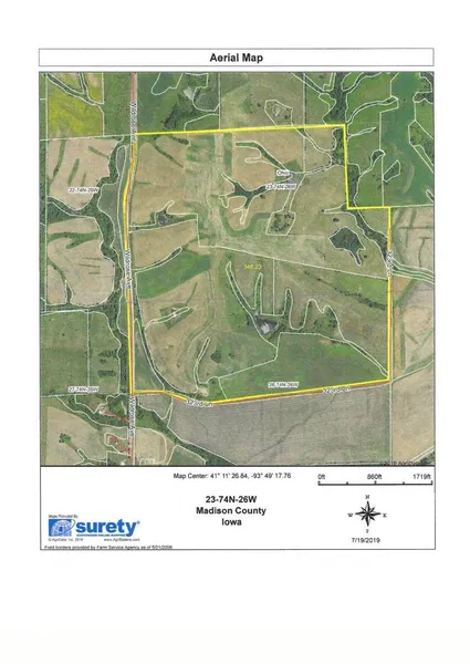 Good combination livestock and grain farm, 353 m/l acres in Madison County, Iowa. 38 acres CRP at $8,000 per year, 100 acres row crop, 120 acres hay and balance pasture to include 5 ponds. Development potential, located just west of I-35 with short drive to Des Moines.