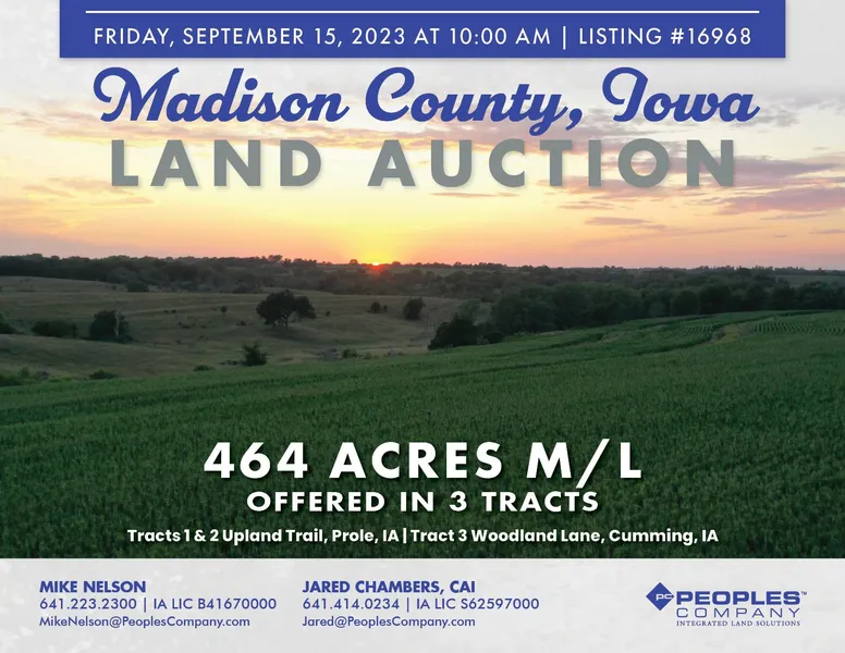 Offering three tracts ranging in size from 120 acres m/l to 184 acres m/l will be offered, presenting a unique opportunity for you to assemble high-quality farmland, pasture land, recreational land, and building sites all located in a high-demand area of Madison County, Iowa. This land has not been made available to the public in many years!