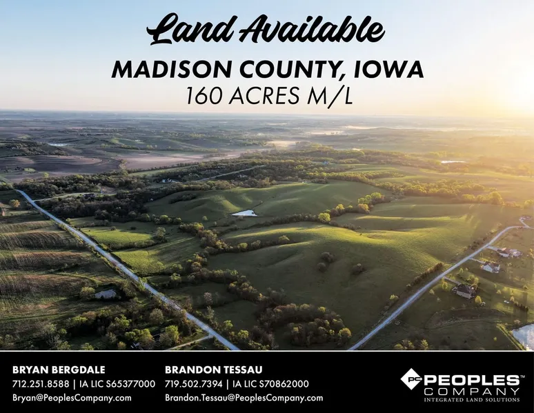 Peoples Company & Knapp Properties are proud to present 160 acres m/l of highly sought after farmland in Madison County, Iowa. Located 10 minutes from Van Meter and 15 minutes from West Des Moines, Iowa, this expansive property offers a rare blend of seclusion, accessibility, and diverse potential in one of Central Iowa's most desirable regions. Featuring lush pasture, wooded draws, and multiple ponds, this parcel is perfectly suited for livestock grazing, recreational use, or as a long-term investment.