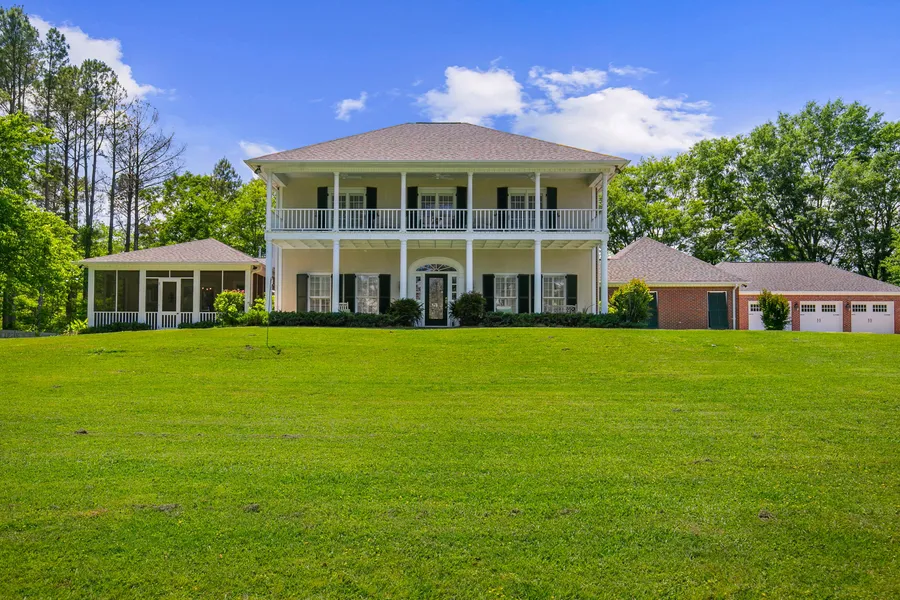 This 4952 sq. ft. 5 bedroom 4 bath home sits at the top of a hill on 4 acres with an iron fence encompassing the entire lot. The traditional southern style home has a wide foyer with a large formal dining room on one side and a sitting parlor on the other side. Continuing down the foyer is a guest bedroom and guest bath. The foyer then leads to a den with a ceiling extending to the top of the second floor and has a fireplace and wet bar area. The kitchen is off the den and includes an island and dinning area with granite counter tops. The downstairs Owners suite is truly a suite including a large sitting area with fireplace, a screened patio, and large bath. Separate sinks, toilets and closets are included. In addition to the tub is a HUGE shower with separate shower heads and controls. Also included on the ground floor is a large laundry area. The second floor has 3 large bedrooms 2 baths and an office. One of the bedrooms is a second Owners suite complete with bidet! Two of the bedrooms open to the second floor balcony and there is a second clothes washer and dryer upstairs, no need to bring cloths down stairs! To complete the home is a large outdoor screened living area built to enjoy the peace and quite of the neighborhood. This area includes a complete outdoor kitchen, island bar and wood burning fireplace. Entertaining out here under the fans in the spring and summer or in front of the fireplace watching ballgames in the fall and winter is hard to beat!