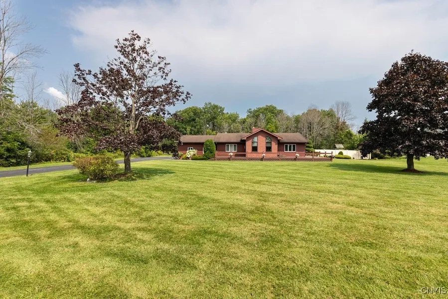 Unique Contemporary Ranch in a beautiful country setting overlooking a scenic golf course! Ideal location to main roads, NYS Thruway access, nearby amenities & entertainment. Situated on a deep, vast 1.72-acre lot w/an additional 1.11-acre lot (wooded w/creek) behind property included w/sale. Long double wide driveway & parking accommodates many guests. Fully fenced private backyard w/in-ground pool (diving board & slide), pool house w/half bath, playset, JennAir grill & expansive wrap-around deck/porch makes this the perfect venue for hosting parties & events. Front door entry opens to a spacious livingroom w/cathedral ceiling, see-through fireplace into dining room, hardwood floors & bright, natural light that bathes in through prominent windows. Kitchen w/stainless steel appliances & wine cooler, plenty of cabinet & countertop space & convenient garage entry. Main floor w/full bathroom, ample size bedrooms w/walk-in closets & primary bedroom w/ensuite bath. Full finished basement w/ceramic tile flooring has a recreation room w/bar, family room, bonus room, laundry room (washer/dryer included) w/half bath & 2 utility/storage rooms. Plus dual sump pumps & whole house generator.