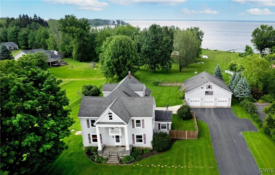 63 ft+ of Prime Oneida Lake Waterfront on a 1.5 Acre Lot?! Rarely does a property like this come to market. This 4-bedroom, 3-bathroom home with garage loft apartment offers not only comfort and charm, but also incredible flexibility to grow with your needs. Throughout the home, original hickory floors complement the rich wood trim, French glass doors, and beautifully crafted oak pocket doors. Two formal front sitting rooms, a classic billiard room, an elegant dining room, an updated kitchen, and a sun-drenched sunroom on the first floor- offer versatile areas for first floor bedrooms or entertainment needs! Dual staircases provide access to the second level, where the primary suite awaits—featuring a private ensuite bath and the potential for a second-story terrace to take in breathtaking waterfront views. Three additional bedrooms share a full bathroom, with access to a walk-up attic o...