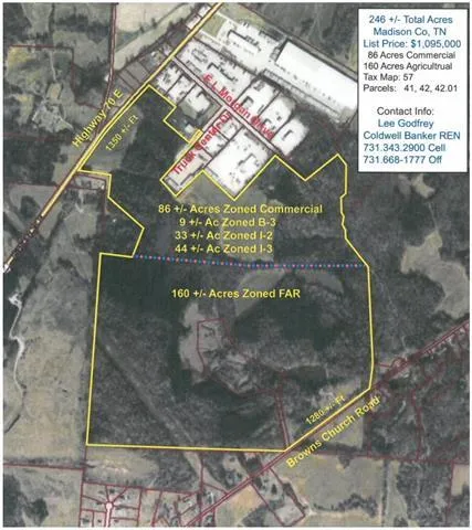 Rare find 246 +/- total acres on Hwy 70 E & Browns Church Road. 86 acres commercial (9 ac B-3, 33 ac I-2, 44 ac I-3, 160 ac FAR) 1300+ front on Hwy 70 E, 1200+ front on Browns Church Road.