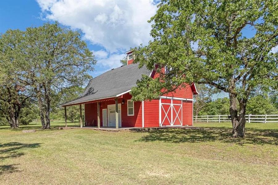 10 acres of beautiful Texas countryside just waiting for your ranching dreams! This property offers a unique combination of mature trees and open pastures with stunning views, exactly right for a weekend getaway or full-time homestead. Fully fenced. The beautiful red barn dominium includes 1120 sf of shop with a half bath downstairs and 800 sf upstairs offering a large living space with kitchen and full bathroom. Step outside to find a 35x35 pole barn with tack room, orchard with 20 trees and watering system, one-acre pond to fish that includes an aerator, luscious trees situated around the property and several acres already cleared awaiting your vision. There is a 3-bedroom, 2-bathroom mobile home built in 1983 on the property, that will be sold as-is. Live in there while you finish out your dream! Rhino and riding lawn mower negotiable, pool table and couch included. Both city water and septic on site, well water serves orchard and corral. Bring your horses today and make this yours!