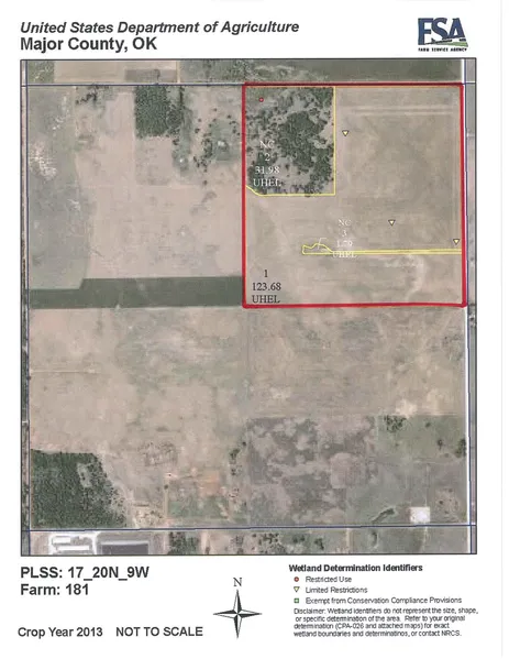 This highly productive small grain/livestock farm is situated 1/2 mile east of Ames, then 2 miles south on a good rocked county road. According to the Major County F.S.A. there are approx. 123.7 acre of cropland with an 85.2 acre wheat base & a 32 bushel per acre yield; & a 35.6 acre corn base with a 68 bushel per acre yield. Principle soil types of the cropland are Lovedale fine sandy loam, Class II; Meno loamy fine sand, Class III; & Nobscot fine sand, Class III. This land lays level & is easily tilled. The balance of the land is in Bermuda grass & trees providing excellent grazing & shelter for livestock & wildlife habitat. Improvements include electricity, water well, and irrigation well. Legal Description: NE/4 of 17-20-9, Major Co., OK. Minerals: Do not sell. Crop: Does not sell. Possession: is to be given upon payment in full of the purchase price & transfer of title, subject to the existing agricultural lease which expires upon completion of harvest of the presently growing 2012-2013 wheat crop or August 31, 2013, whichever is later. Terms: 10% of the purchase price is to be placed in escrow the day of the auction with the balance being due upon delivery of merchantable title. All information is taken from sources believed to be reliable; however, no guarantee is made by the auction company or its employer. Buyers should satisfy themselves as to acreage, crop base, etc. prior to auction day. Any announcements made the day of the auction supersede all advertising. Contact Vicki Wiggins Allen, 580-554-4400 OR Lynsie Sturgeon, 580-554-2633 for additional info.