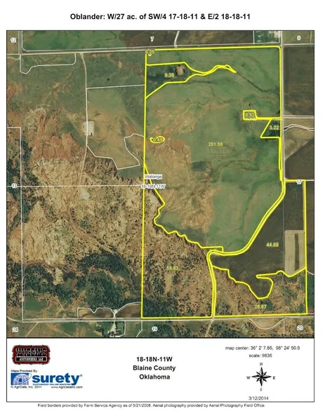 This 347 +/- acres is located from the 4 way stop in Okeene, OK, 4 miles south on SH 8, then 5 miles west on Southard blacktop, & 1 mile south. According to the Blaine County F.S.A., this land is in an F.S.A unit which has 246.27 acres of cropland with a 246.3 acre wheat base and a 27 bushel per acre yield. Approximately 45 acres are currently being tilled. The balance of the land is established in improved blue stem grass and native grasses, scattered timber, and a pond. Rural water is present on the south side of the farm and is easily accessible on the north. This farm is ideal for excellent wildlife habitat, hunting, if desired and outstanding livestock production. Be sure to take a look! Legal Description: W/27 ac. of SW/4 17-18-11 & E/2 18-18-11, Blaine Co., OK. 13 Taxes: were approx. $653.00. Minerals: Do not sell. Crop: Does not sell. Possession: Possession of the cropland will be given upon payment in full of the purchase price and transfer of title, at closing, subject to the completion of harvest of the presently growing 2013-2014 wheat crop or July 1, 2014, whichever is later. Possession of the grassland will be given upon payment in full of the purchase price and transfer of title, at closing. Terms: 10% of the purchase price is to be placed in escrow the day of the auction with the balance being due upon delivery of merchantable title. All information is taken from sources believed to be reliable; however, no guarantee is made by the auction company or its employer. Buyers should satisfy themselves as to acreage, crop base, etc. prior to auction day. Any announcements made the day of the auction supersede all advertising. Contact Lynsie Sturgeon, auction mgr at 580-554-2633 OR visit wigginsauctioneers for pictures and an aerial photo.