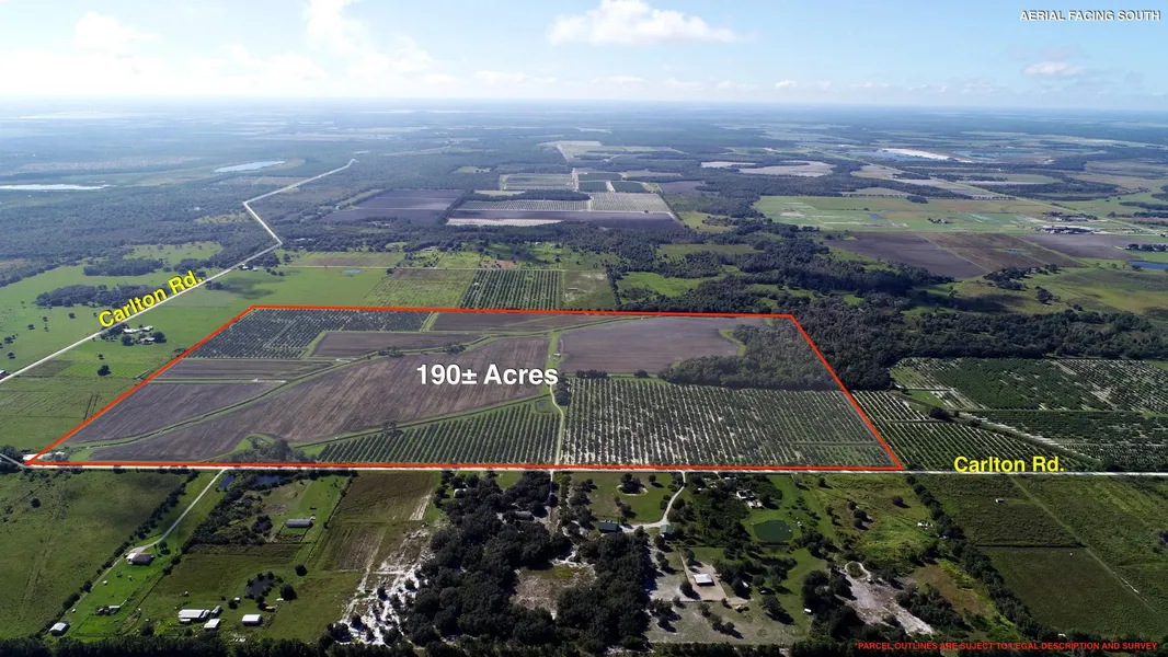PROPERTY DESCRIPTION The opportunity is to purchase a 190-acre farm on Carlton Road Parrish. It consists of approximately 110 net acres of row crop farmland and 60 net tree acres of grove (Hamlins). It also has 3,600+ feet of frontage on Carlton Road.