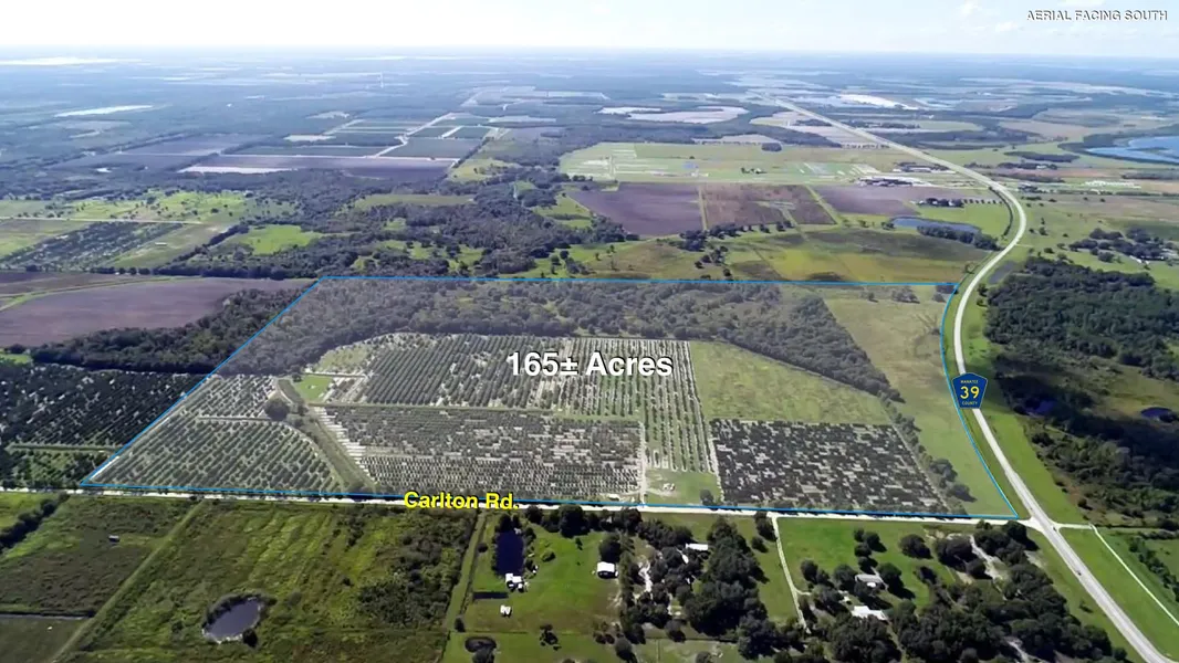 PROPERTY DESCRIPTION The CR 39 Grove property is a 165-acre tract located on County Road 39 and Carlton Road in Parrish in north Manatee County. The property is a combination of grove, improved pasture, and native Florida. It also has 2,300+ feet of frontage on County Road 39 and 2,800+ feet of frontage on Carlton Road.