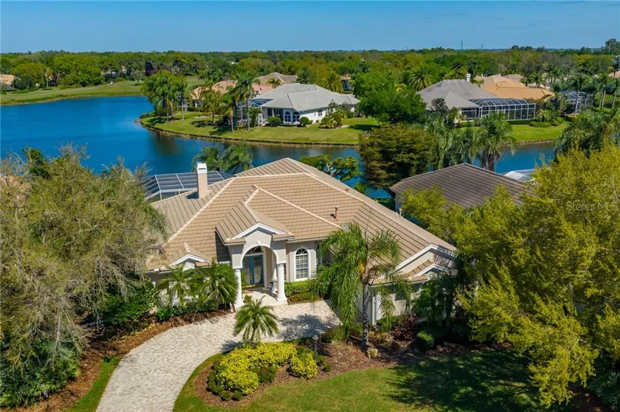 Gated University Park Country Club is well known, admired and sought after for its location, amenities and especially its beauty. The Langley neighborhood of only 31 beautifully designed homes on a cul-de-sac street is one of its gems. This home is truly a beauty and epitomizes the best of Florida indoor/outdoor living. This split plan home with 3 bedrooms, 3 baths, and pool with study/office is absolutely one of the more beautiful homes we've had the pleasure to bring to market. Upon entering through the double beveled glass doors you will immediately have a sense of space and notice an abundance of natural light, tasteful soft color palette and lake view. Many of the primary living areas provide lake views and wetlands inhabited by beautiful birds plus the golf course beyond. The living room features a raised hearth gas fireplace with tile surround and coral stone mantel as the centerpiece of this lovely room. Adjacent dining room is spacious with a 13' coffered ceiling and built-in buffet. The ensuite owner's retreat is large and includes a sitting area, coffered ceiling and walk-in closets with builtins. The kitchen offers gas appliances (new in 2019) which include a 5-burner cooktop, granite counters, stepped, roped and raised panel cabinetry and a breakfast nook with aquarium glass. The kitchen is open to the family room with built-in entertainment center and sliding glass doors leading to the lanai, pool/spa and cafe area with outdoor kitchen. The office/study at the rear of the home features a cathedral ceiling, builtins with adjustable shelves and sliding glass doors leading to the lanai. This home has a wonderful view of the lake, wetlands and golf course. The large garage with separate golf cart door will easily accommodate two cars and has an epoxy-coated floor (new in 2017) and cabinet storage plus work station. Other features include 10'-13' ceilings, generous use of crown molding, soft water system, laundry room, Hunter Douglas window treatments, arched doorways, brick paver driveway, keyless garage entry, landscape lighting, resurfaced Pebble Tec pool and spa (2018) and newer lanai screen. This beautiful home is a must see!