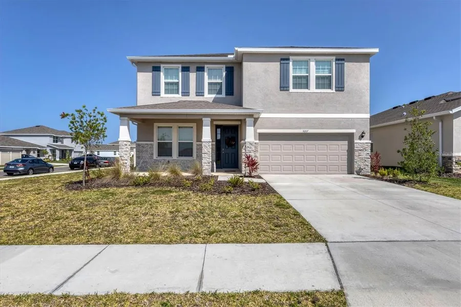 Welcome to the beautiful neighborhood, Silverstone North! Why wait to build when this UPGRADED move in ready home is available? This spacious 4-bedroom, 3-bathroom home with a den is loaded with extras that you will not get with new construction! From the moment you walk in the door, you will notice the open concept floorplan making it the perfect home to entertain friends and family. The kitchen is a chefs dream and features a large island, light cabinets, granite countertops, stainless steel appliances and a Butler's pantry! The living room has a cozy feeling and has a custom shiplap feature wall! As you make your way upstairs, you will notice the large upstairs bonus space perfect for a separate space to unwind! The primary retreat is oversized and features a huge walk-in closet that is attached to the laundry room! The primary ensuite features dual vanities, a soaking tub, walk in shower, and separate water closet for privacy. Enjoy true Florida living on the covered patio overlooking the oversized fenced in backyard! Located on a corner lot, with neighbors only on one side next door! Only a short drive to I75, The Ellenton Outlet Mall and local dining spots.