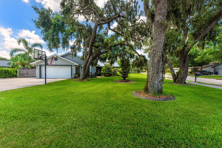 ALL THE HEAVY LIFTING IS DONE! Lovely water views and a beautiful renovation in 2021 to include kitchen and both bathrooms, partial flooring, added wrap-around porch in back, roof and gutters, electrical panel, and AC 2019. This four-bedroom, two-bath home is situated on an oversized corner lot in Villages of Thousand Oaks. Walking up to the home, you are greeted by an enchanting pavered patio overlooking majestic oaks and a peaceful water fountain. Inside, the smartly designed home features a bright and open split plan with plenty of living area's for both large gatherings and entertaining. You will delight in the chef's kitchen with quartz countertops, custom cabinets, waterfall breakfast bar and high-end appliances. Step into the spacious owner's suite offering vaulted ceilings, a large walk-in closet, beautifully renovated bath with dual sinks, and large walk-in shower with custom-et...