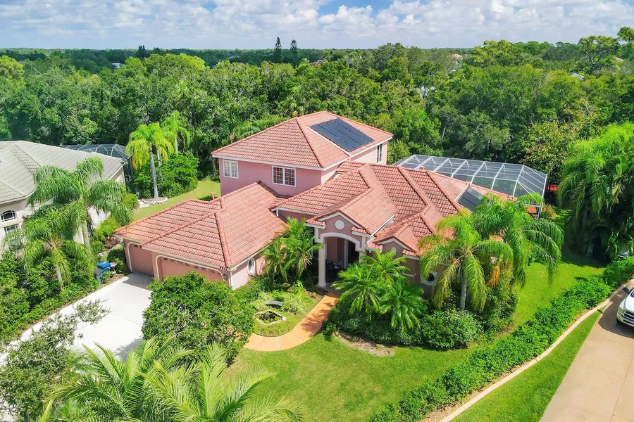This breathtaking custom-built Todd Johnson residence, featuring four bedrooms, a den, and a spacious bonus room, is gracefully positioned on a premium, over one-acre homesite, against the tranquil preserve. With the brand new roof completed in March 2024, one can step into this exceptional property with peace of mind. From the moment you enter, you'll be drawn to the refined ambiance, highlighted by an elegant natural gas fireplace, new designer lighting, fresh interior paint, and luxurious vinyl plank flooring. Expansive sliding glass doors seamlessly pocket, revealing the enchanting lagoon-style pool beyond. The kitchen, a culinary masterpiece, showcases newly painted white cabinetry, a stunning backsplash, a gas cooktop, a walk-in pantry, a separate island and stainless steel appliances, creating an environment for the aspiring chef. The primary suite is a sanctuary, offering an extended sitting area, a custom-designed oversized closet and a spa-like bath complete with dual sinks, a walk-in shower and a soaking tub for ultimate relaxation. The office, positioned at the rear of the home with an elegant wood floor, affords serene views and direct outdoor access, allowing one to revel in the beauty of the surroundings. Ascend the stairs to discover an expansive bonus room, complete with a private balcony that offers captivating views. Two additional guest suites complete the upper level, providing ample space for family or visitors. Outside, the exquisite resort-style saltwater lap pool, stretching over 35 feet and surrounded by lush landscaping and natural stone, exudes sophistication and tranquility. Solar heating ensures the pool remains inviting throughout the year. The outdoor spaces evoke the feeling of a private park, with vibrant gardens and meandering paths offering something new to discover at every turn. At the end of a peaceful cul-de-sac, this home epitomizes privacy and serenity. River Club, a desired golf course community where membership is optional, HOA's are low and there is no CDD, this residence offers an ideal location between Bradenton's SR70 and Sarasota's University Parkway, is just minutes from Interstate 75, is in close proximity to Lakewood Ranch Main Street, University Town Center, top-rated schools, downtown Sarasota, and the pristine, award-winning beaches of Siesta Key. This residence offers an unparalleled lifestyle on every level.