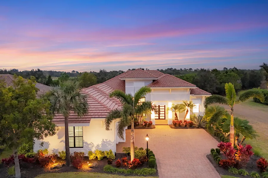 Welcome to the Captiva II model by Stock Signature Homes, a stunning low-maintenance Country Club East residence that combines contemporary design with exceptional functionality. This beautiful home sits on a private, wooded lot with an easement next door, ensuring privacy and breathtaking views of a serene pond. The home's striking modern black iron and frosted glass doors invite you into a spacious foyer, where a mirrored wall treatment adds an elegant touch. Inside, you'll find an open floor plan that allows natural light to flood the space. The expansive great room features 12-foot ceilings, pocketing sliders that open to the lanai, and modern white ceiling beams that enhance the room's airy feel. Off the great room is the kitchen, offering a large island with additional storage, quartz countertops, and high-end appliances such as a Fulgor Milano refrigerator and dishwasher, GE Profile five-burner cooktop, oven and convection microwave. Adjacent to the kitchen is an eat-in dining area, perfect for casual meals and family gatherings. A spacious walk-in butler's pantry with modern cabinetry makes it easy to store culinary essentials. This home offers four bedrooms and three-and-a-half baths. The primary suite is a true sanctuary, featuring a 12-foot tray ceiling, two walk-in closets with built-in organizers, and French doors that open to the lanai, bringing the beauty of the outdoors in. The en-suite bath includes dual sinks, a freestanding tub and a walk-in shower. The home's design also includes a flexible fourth bedroom, perfect as a secondary primary suite or bonus room, complete with an en-suite bath and pool access. Bedrooms two and three share a Jack-and-Jill bath with dual sinks and a tub/shower combo, the perfect space for family or guests. The den with a 15-foot ceilings and wooden feature wall is the perfect space for a quiet retreat. A convenient powder room with stylish lighting and a lit vanity is also available for guests. The large laundry room provides abundant storage and counterspace, while the oversized three-car garage features durable epoxy floors. The home also boasts impact windows and doors for added security and energy efficiency. The large lanai features a heated pool and spa, complete with a waterfall feature, sun shelf, colorful pool lighting and built-in lanai cage lighting. The spacious outdoor space includes an outdoor grill with an exhaust fan for alfresco dining. Additional details include a gas water heater with a hot water recirculation system for instant hot water, low-voltage landscape lighting, and a recently updated irrigation system. Country Club East residents enjoy exclusive access to The Retreat, a neighborhood amenity center boasting a resort-style pool, fitness center, and billiards room. Additionally, The Residents Club offers another pool, spa, and a volleyball court for residents to indulge in leisure and recreation. For those seeking more recreational options, just a few streets away lies the Lakewood Ranch Golf & Country Club, featuring 54 holes of golf, 20 Har-Tru tennis courts, 20 pickleball courts, multiple pools, Grand Clubhouse, and The Lodge bar/restaurant. Residents have the option to avail themselves of these facilities through various membership packages. Discover this gem in Lakewood Ranch, America's top best-selling, master-planned multigenerational community.