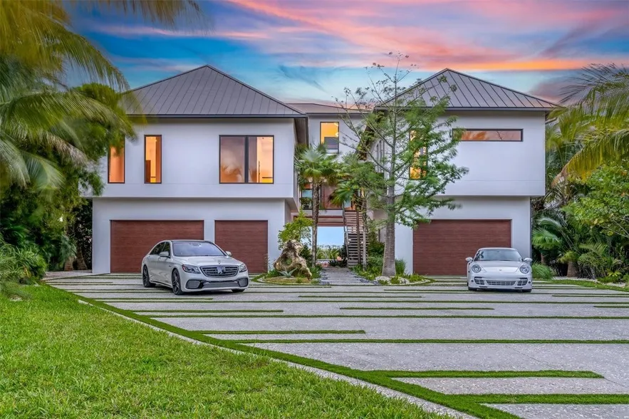 Welcome to 5861 Gulf of Mexico Drive, a contemporary home that exudes Zen-like calm in a tropical jungle garden located on over an acre beachfront estate on Longboat Key. This masterpiece of tropical modernism spans a stunning 1.1 acres with 100 feet of direct Gulf frontage, offering privacy, breathtaking views, and a sophisticated lifestyle experience. Seclusion and privacy begin with an eight ft solid concrete and Brazilian hardwood entry gate. Upon entering, you are welcomed down a path that leads you past two free standing accessory buildings that allow for multiple creative uses. The ground floor includes garage space for five vehicles, elevator lobby, social outdoor poolside areas, and storage. Continuing to the main structure, you are greeted by custom design to blend clean, modern lines with a warm, natural ambiance throughout the entire home. The home features custom finishes, ...