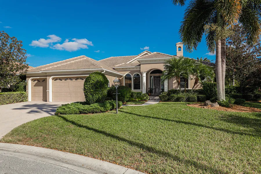 Welcome to this custom built Todd Johnston home in Lakewood Ranch Country Club. This property is situated on a gorgeous lake and cul-de-sac homesite. Lovely wood columns upon entry. Cozy living and dining rooms. Two fireplaces, one in gathering room and the other in living room. Plantation shutters, crown moldings, niches and tray ceilings. Tile flooring in main areas. New tile in owner's bedroom. 3 bedrooms, 2 Ž baths. Great den has wood floors and French doors off to an outdoor patio. Gourmet kitchen with granite center island, designer cabinets and counter with seating. Tile backsplash. Breakfast area has aquarium window. Desk with cabinetry off kitchen area. Gathering room has a wall of built-ins and sliders that take you off to the alluring infinity edge pool and rock trim. Paver lanai and seating area. No heater for the pool however it is wired for a heater. Spacious master offers a massive walk in closet with built-ins. French doors off to the pool. Dual sinks, walk in shower, garden tub, private water closet and vanity. 3 car garage and large laundry. Close to UTC Mall, shopping, polo, soccer. A-Rated schools.