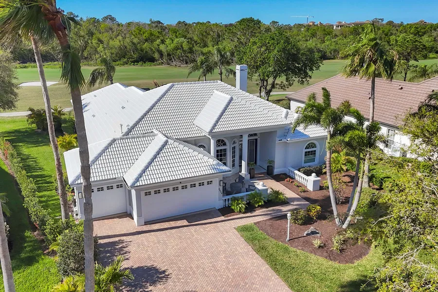 On a tranquil cul-de-sac in Lakewood Ranch Country Club, this beautifully upgraded residence welcomes you with lush landscaping and a paver driveway leading to a three-car garage. A charming walkway guides you to the covered piazza set for entertaining. Glass double doors with an arched transom window set the tone for the elegance within. Inside, soaring ceilings and rich architectural details create an inviting atmosphere. Two columns frame the formal living and dining areas, enhanced by lighted soffit shelves. A marble wood-burning fireplace, flanked by built-in cabinetry with quartz countertops and an art niche adds refinement. A new dry bar with a wine refrigerator elevates the space and sliding doors with a transom window fill the room with natural light. Beyond glass French doors, the fully remodeled kitchen is a dream, featuring quartzite countertops, custom-organized cabinetry, a...