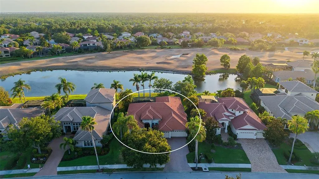 Under contract-accepting backup offers. ACCEPTING BACK UP OFFERS! Welcome to one of the finest and most beautiful lots in the Lakewood Ranch Country Club with unmatched long, peaceful lake views and gorgeous golf course vistas! The view of the 13th fairway of the King's Dunes Golf Course is truly spectacular and breathtaking especially at sunset. This custom John Cannon Homes floorplan includes 4 bedrooms, 3 baths and an executive office is located in one of Lakewood Ranch Country Clubs premier neighborhoods, The Dominion! Enter through double wood and glass doors and notice the architectural details including transom windows, soaring ceilings, arched doorways, and custom moldings throughout. The separate dining and living rooms open up to spacious lanai which is perfect for entertaining family and friends. The primary suite features tray ceiling, 2 walk-in closets, and two sets of sliding glass doors that open to the gorgeous and inviting pool and spa. The updated spa like primary bathroom boasts porcelain tile floors, granite counters, and a freestanding soaking tub, and walk through shower with dual shower heads. Situated by the primary suite is the den/office with bamboo floors, which overlooks the lushly landscaped front yard. The bright and well-appointed kitchen is a chef's dream with custom wood cabinetry, quartz countertops, a large island, and breakfast nook area. Situated on the other side of the home for utmost privacy, the second and third bedrooms have large closets and one with a delightful bay window with seat and two additional bathrooms, as well as an executive office with built in desk, shelving and storage provide the perfect space for working remotely. This office includes convenient closets, so it could even be used as a 4th bedroom. OTHER NOTABLE FEATURES INCLUDE: newer hurricane rated sliding glass doors in the great room, new hot water heater in 2024, newer AC unit, new pool heater in 2023, new dishwasher and refrigerator in kitchen, and a $7000 credit from sellers for a newly designed outdoor kitchen. Lakewood Ranch Country Club offers the ultimate Florida lifestyle with a private Country Club with 3 luxurious clubhouses, 4 golf courses, 18 Hard-Tru lighted tennis courts, pickleball courts, state of the art fitness center, aquatic center, parks, walking trails and so much more. Membership is optional and no waitlist. All within minutes of the UTC Mall, fabulous dining and shops, Lakewood Ranch Main Street, polo fields, Benderson Park, and the much-anticipated new home for Mote Marine Aquarium. Plus, don't forget you're only a short drive to the world's top-rated beaches! This is truly luxury at its finest, schedule your private showing today.