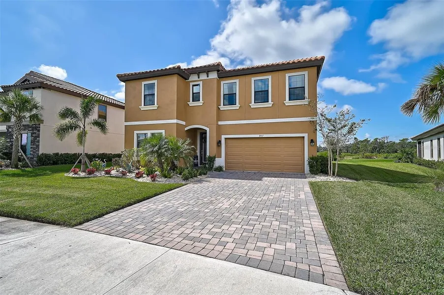 Discover this beautifully upgraded 5-bedroom, 3-bath home in the desirable Crosswind Ranch community—offering a rare combination of style, comfort, and a serene, private setting. Situated on a premium lot with no rear neighbors, this home offers a peaceful backdrop of lush greenery, providing added privacy and space to relax. Step inside to an open-concept floor plan featuring elegant coffered ceilings in the great room and dining area, bringing a refined touch to everyday living and entertaining. A spacious desk nook with a custom shiplap accent wall sits just off the kitchen—ideal for work-from-home days, homework sessions, or creative projects. The chef’s kitchen is a showstopper, offering an expansive walk-in pantry and seamless flow into the dining and living areas, making it the heart of the home. With one bedroom and full bath on the first floor, guests enjoy comfort and privacy, while the upstairs retreat features the owner’s suite, three additional bedrooms, and a generous bonus room—perfect for movie nights, a playroom, or a flex space tailored to your lifestyle. Crosswind Ranch offers the charm of Florida living with amenities such as a community pool, cabana, pocket parks, and scenic water and conservation views. Homes here are known for their tile roofs, paver driveways, and modern yet timeless architecture from the Innovation and Artisan Series.