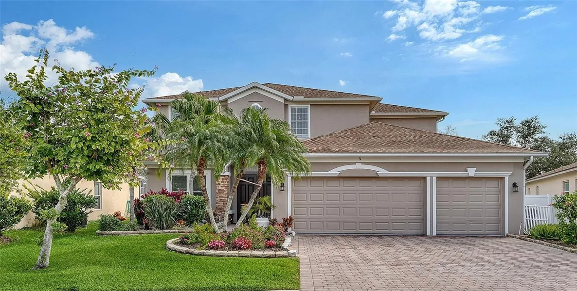 This stunning 4 bedroom and 4 bath pool home is architecturally pleasing inside and out, and meticulously cared for by the owners. Exteriorly, this beautifully landscaped property, with a fully fenced backyard, features a newly painted house (2025) with custom stone detail, newer roof (2021) and gutters (2024), and a brick paver driveway leading to a 3-car garage. Upon entering the home, interior attention to detail is also apparent: rounded archways and insets; handsome Brazilian cherry wood and marble floors; a lovely staircase with wrought iron accents; and 10-foot ceilings for an airy, breezy feel. The open floor plan, with lots of natural light from windows and sliders, leads seamlessly from the spacious living room to the breakfast area and kitchen. There is a separate dining room for entertaining which is decorated with wainscoting and marble floors, while there is also a bonus room/den overlooking the lanai, and a 5th bedroom, which is currently used as an office, with a tray ceiling and view of the front yard. Perfect for any chef, the kitchen is equipped with large wood cabinets, work island, breakfast bar, food pantry, and all stainless GE Profile appliances including double ovens and new refrigerator and microwave (both in 2023). An osmosis water system and water softener were smartly installed in 2018, and the tank replaced in 2025. All downstairs windows are hurricane proof and tinted (2021), and the home has 2 newer AC units (2019), a Rheem 80-gallon hot water heater (2025), and an upgraded Nest security program. Four bedrooms highlight the upstairs: the primary bedroom suite; 2 front bedrooms which share a Jack and Jill bath; and a back bedroom with its own ensuite bath. French doors lead into the huge primary bedroom with a tray ceiling and a deck attached for watching the sunsets, an oversized closet with built-ins, and a large ensuite bath with Jacuzzi tub, separate glassed shower and dual sinks. Lastly, and very important, is the private backyard oasis featuring a screened-in area with brick pavers, heated pool and spa with newer pool heater (2019) and pool pump, and covered dining area. Residents of the wonderful community of Riomar in Cascades at Sarasota enjoy low HOA fees, a community pool, and a prime location near to University Parkway and Towncenter Mall with amazing satellite stores and restaurants, SRQ airport, famous beaches, and the arts and all that downtown Sarasota has to offer.