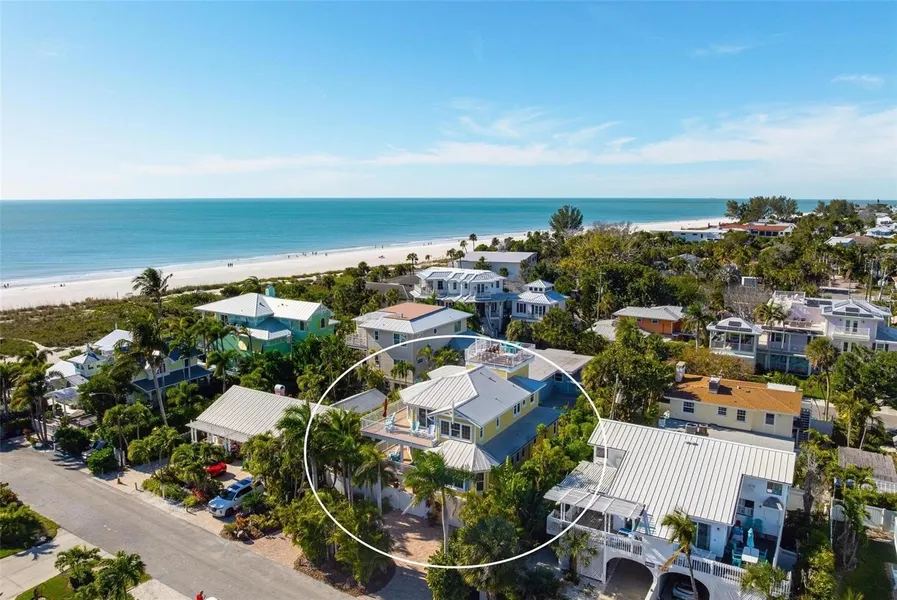 From sunrise to sunset, stunning Gulf views throughout the house. One of the most outstanding features of this property is the expansive rooftop deck—an irreplaceable amenity due to current height restrictions. From this vantage point, take in breathtaking Gulf sunsets, views of the Sunshine Skyway Bridge, and sweeping 360-degree panoramas of the island and surrounding waters. The elevated position of the street further enhances views and peace of mind. The home was thoughtfully designed by award winning architect Emily Anne Smith. The floor plan with four bedrooms, including two luxurious primary suites. Every bedroom features a private en-suite bathroom, complemented by two additional half bathrooms for a total of six bathrooms. A separate washer and dryer add convenience. The layout is designed to maximize natural light and capture views from sunrise to sunset. Both living levels feature wrap around decks with large seating and lounging areas. The second living level hosts a spacious primary suite with heated bathroom floors, a jacuzzi-style soaking tub, large