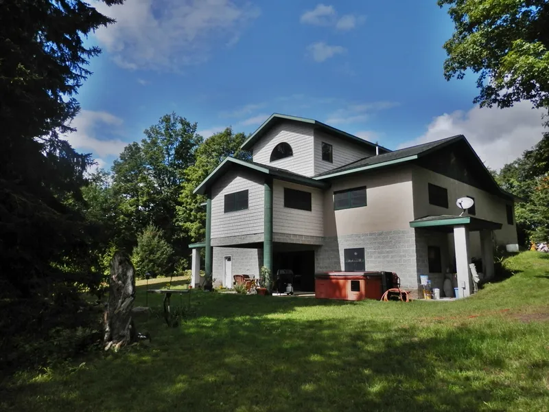 Seclusion! Across street from State land and built like a fortress! About 11 acres of beautiful woods and meadow with 66 foot easement off Glovers Lake Rd and 121 ft. of frontage on Swanson Rd. Built by a mason with 14 inch thick walls, glazed concrete floors, high ceilings, open floor plan and Andersen Series 3 windows with argon gas. Upper level is master suite with bedroom, adjoining sitting area & private bath. Huge kitchen area but kitchen is not in.(Price reflects the need for buyer to install kitchen of their choice.)Rest of main floor consists of LR, DR area, laundry/mudroom, bedroom and full bath. Walk-out lower level family room with huge brick & stone shower and kitchen or bar area. Outside wood furnace for in floor radiant heat & hot water. Potential for living off the grid.