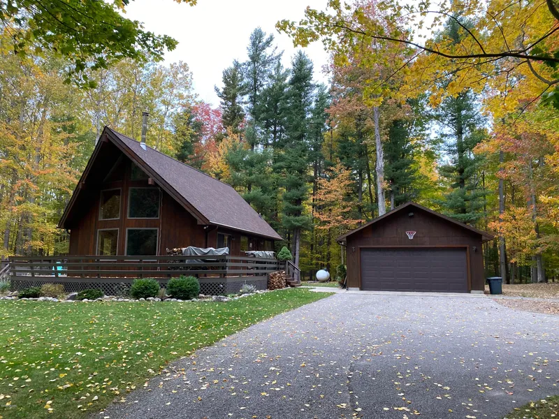 Less than 1 mile to the beautiful Magoon Creek access to LAKE MICHIGAN from this move-in ready yr-round get-away or full-time home. This is THE most beautiful wooded setting you will probably ever find! Trails wind throughout this park-like setting, which is all the relaxation therapy you'll ever need. Absolutely no traffic noise; only the sounds of owls. Inside you'll find the master suite/loft with a walk-in closet. 1 BR on the main flr. The main-flr laundry rm/office could be converted back to a BR. Wonderful open feel in the vaulted living rm with a cozy wood-stove and access out to decks on either side of the home. The 1/2-finished lower level has stairs outside; ideal for easy storage access. Cedar inside/out. granite counter tops in kit. Needs nothing ... move-in ready. Paved road.