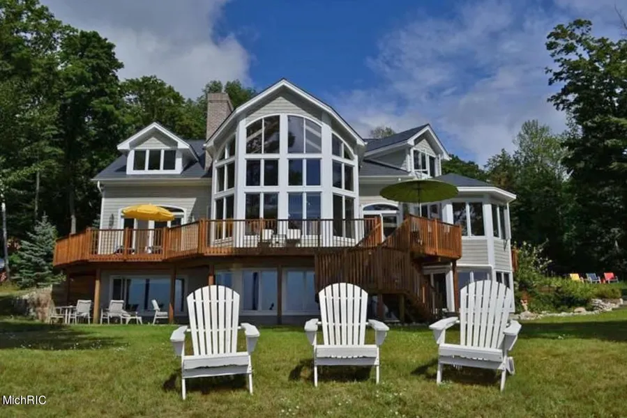 This gated property is a hallmark of peace and privacy with 10 wooded acres and 180-degree stunning views of Lake Michigan. Just 3 miles south of Arcadia Bluffs Golf Course and 2 miles north of Portage Lake. Designed in the style of a European waterfront estate, priority was placed in maximizing the views and privacy on a high vantage point overlooking the Lake. Custom built with materials and product designs individually tailored with an emphasis on capturing the natural light of Lake Michigan and surrounding woods. Custom features include electric tram to the beach, lakeside deck, heated floors, audio throughout, wine cellar, 3 fieldstone fireplaces, and red cedar exercise room with sauna & indoor hot tub. 40x80 barn with commercial doors, ideal for storing boats, RVs, and other toyThe fully equipped kitchen features double convection ovens, down-draft cooktop, and grill in the center island. The living room features a 38-window design to provide incredible floor-to-ceiling waterfront views. This 6,500 sq. ft. home embodies many high-quality materials including handcrafted imported tile and Amish craftsmanship. There are 124 windows and 14 remote-controlled skylights throughout for a naturally bright living space on all three floors. Holds high speed cable internet and DirecTV. Access to the beach is provided via a commercial grade tram with computer controls for speed, braking system, and all commercial safety features. Pure peace and privacy are yours with only five homes on this 4-mile stretch of Lake Michigan frontage. Three miles of the shoreline have been deeded to The Michigan Conservancy to be kept in their natural state and free of development