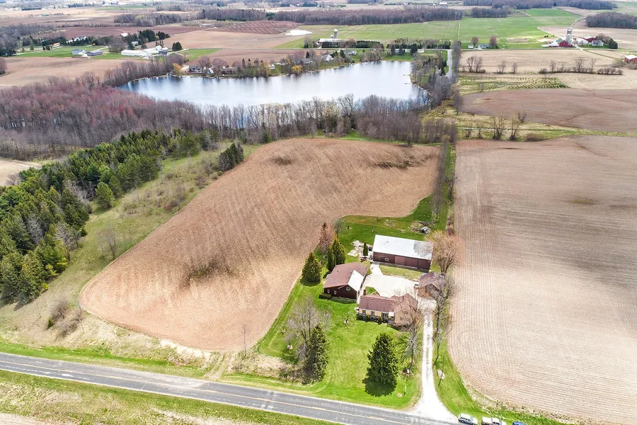 IDEAL COUNTRY PACKAGE ALL-IN-ONE! This is a Manitowoc County best buy! Over 15.5 acres total. Enjoy this totally renovated farmhouse built originally in 1875. Gorgeous addition (1989) with full basement (which has a 5th BR and full bath) & great room w/old barn beams, built-ins, vaulted ceiling & wood ceiling & corner wood stove w/quick access to the BRIGHT sunroom w/tiled flooring, windows galore PLUS skylight! Beautiful kitchen w/pantry, center island, tiled counters & floors w/dining area, don't forget the maple cabinetry made by the seller...WOW! The 1st-floor master bedroom is very convenient off the dining area. Large laundry/mud room w/tiled floors & access to the main floor full bath. Upstairs has 3 bedrooms, half bath & SUPER-SIZED walk-in closet/storage room. Over 647' of lake frontage on Carstens Lake (20-acre lake, no-wake). Barn (34x68); Grainary (20x30); detached garage (24x26); workshop (1476SF)...wood working shop & much more. PRE-CERTIFIED. Central vac & many updates including septic in 2009, Ideal location w/quick access to Hwy 42. Some tillable land & woods by the lake. Seller uses wood heat & lp gas boiler. PRE-CERTIFIED.
