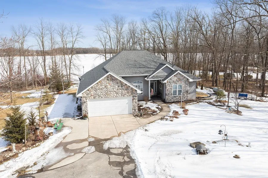 COME HOME EVERYDAY TO the Lake, Bullhead Lake that is, which is a 70-acre lake w/panfish, largemouth bass, northern pike & walleye. No wake lake minutes from Brillion & in Brillion school district. Gorgeous views of the lake from the back & views of country from the front! Updated home w/100' of frontage including a beach, 2 docks & storage shed to enjoy during summer! Dead-end location w/51x26 EXTRA garage, 3.26 acres. Built in 2002, enjoy over 3200SF of finished living, 1st-floor laundry, open concept w/LR-KT-DR which features hardwood floors, tall ceilings, floor to ceiling windows & stone-gas fireplace. Master suite w/2-way fireplace, master bath w/double sinks, WIC & shower PLUS access to sunrm. LL has rec rm, FP, game area & LL bedroom.