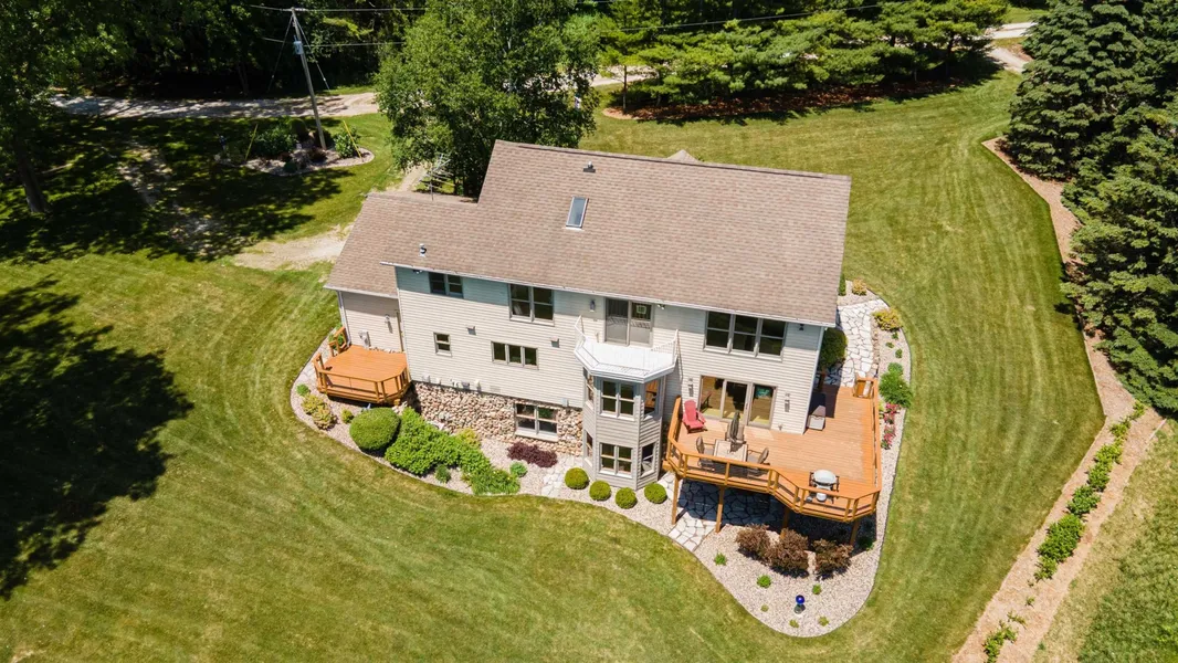 IMPRESSIVE country, waterfront, walkout 2-story nestled on 6.5 acres w/over 661' of Manitowoc River frontage PLUS a private-dead end road...WOW! Stunning features from inside to out as you tour this property. Extra 2.5 car garage for toys or workshop. 2-story great room is absolutely beautiful w/windows everywhere PLUS a upper loft. Hickory hardwood flrs, pine tongue & groove ceilings, tile flrs, gourmet KT w/huge center island, high end appliances & a 9x7 pantry..my fav! 1st flr laundry/mud rm, finished att garage, 1st-flr BR off foyer along w/half bath. Upstairs has a sensational ensuite w/your own balcony, vaulted ceiling, WIC & full bath PLUS views of the river. LL is a walkout w/sewing rm w/built-ins, full BA, fam rm w/FP & 4th BR. Endless Updates. 48 hour binding acceptance