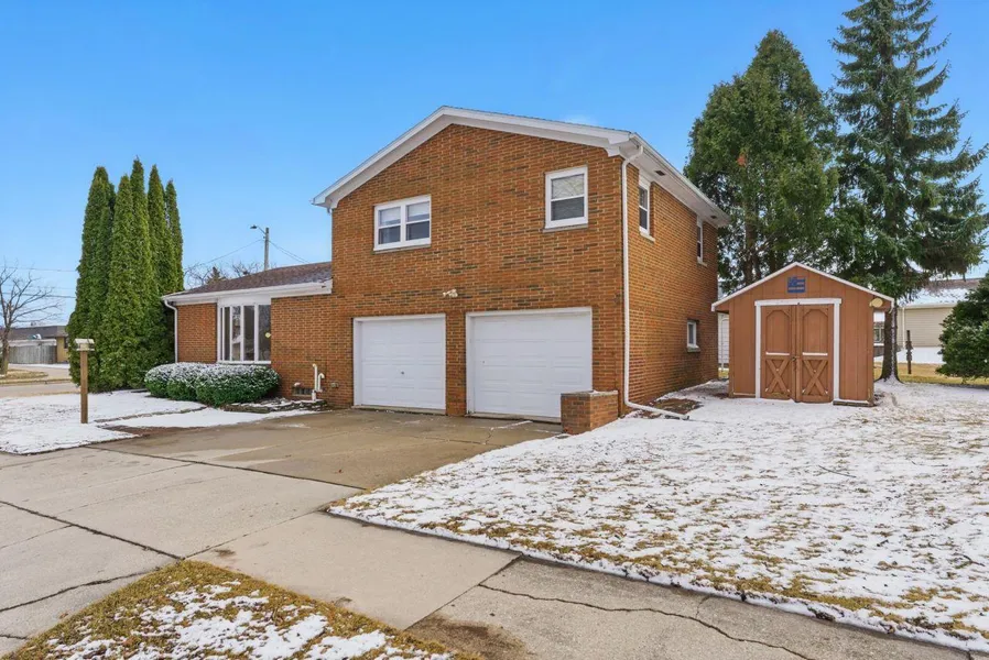 This almost all BRICK home is conveniently located close to shopping but yet tucked away in a quiet neighborhood. The attached 2 car drywalled garage has access right into the kitchen making it easy to dispense groceries. There's natural wood cabinets, updated counters, a storage closet and a convenient 1/4 bath tucked around the corner. The main floor flows well between the KT, DA and LR. The great focal point in the LR is the all brick wall with Natural FP w/electric insert and for extra light there's a nice bow window. Upstairs you'll find a large bath with HUGE vanity and 3 ample sized carpeted BR's with the primary BR having double closets. Rec-Room could use some of your personal/creative touches to make this your dream room. Practical garden shed patio area. Extra insulation in attic