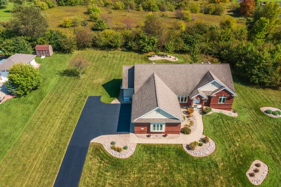 Stunning, executive 1 story home on over an acre in the DC Everest school district near Rothschild elementary school. With views of Rib Mountain and Mosinee Hill, this very unique home has brick accents on the exterior and nearly 2900 square feet just on the main level. The lower level has in-floor heat and a new Smart IBC boiler in March 2019 that has phone controls with nearly 1500 square feet recently finished in Fall 2015. New air conditioner in May 2020. New Smart Thermostat with phone controls, radon mitigation system & solid 4-panel doors. Gorgeous front entryway with accent tile flooring, formal dining room with exquisite hardwoods floors, dimmer lighting, trayed ceiling, powder room with granite counter for guests, spacious living room with gas fireplace and a wall of windows overlooking the lush lawn are adjacent to the kitchen with Featherstone cabinetry, granite counters in Fall 2011, induction cooktop, 1 year old refrigerator, under cabinet lighting, dimmer lighting over the island, tile backsplash, updated faucet, updated sink, updated garbage disposal, spice rack drawer, USB outlet, deep drawers, pull out garbage/recycling drawer, newly added soft close mechanism on the cabinets in Fall 2019, pull-out pantry with an additional pantry added by Featherstone in Fall 2011. A dinette area can double as a sunroom with custom cabinetry and desk by Featherstone added in Fall 2011. A French door walks out from the dinette to a concrete patio that is partially covered and perfect for grilling. The home has a split bedroom floor plan with two bedrooms and a full bath on one wing and the master suite on the other. All bedrooms have a walk-in closet with closet shelving and organizers added Fall 2011. The master bedroom has a trayed ceiling, an oversized walk-in closet, trayed ceiling, private bath with jet tub, walk-in tile shower with accent tiles and two shower heads, dual vanities, private toilet room and heated tile floors. Updated paint and LED lighting throughout the home. Newer lighting and mirrors. Owner will consider selling some furniture. The mudroom area offers a walk-in coat closet with a tower of shoe organizers and a separate main floor laundry room with etched door, automatic light & new washer and dryer from Fall 2011. The lower level family room has large windows and is wired for surround sound. A rec room area offers a wet bar with deep sink and mini fridge. The 4th bedroom has a secret storage space and is next to the 3/4 bath. The 17x12 exercise area is adjacent to the French doors that lead into the office complete with Bluetooth ceiling fan and walk-in closet. An automatic light turns on as you walk into the 27x17 storage area which can be turned into another playroom, theater room and more! An additional 35x13 storage space has stairs to the garage and exterior. The garage was newly insulated Fall 2019. There are large windows, a floor drain, hot/cold water hook ups, 3 separate overhead doors each with their own electronic keypad to allow for ample space in this 35 wide x 25 deep garage. Outside, the owner added rock and landscape edging along with a boiler sensor to communicate with heating the interior. Beautiful Burning Bush perennials highlight the front of the home. Newly resealed blacktop driveway September 2021. Holiday lights are a breeze with outlets around the front door for stringing lights and a switch inside to control them. Outdoor lighting is on timers. Enjoy the trail through the wooded grove in the back of the lot where there are wild strawberries, crab apples or sit around and enjoy a campfire in the fire pit. With the wooded backdrop, the deer and turkey are a delight to see. High speed internet with Spectrum and TDS available.