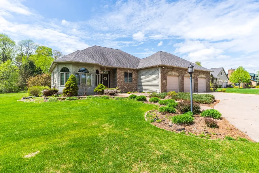 Golf course life is calling you! Just walk to the course. Views of the 7th hole flag are seen right from your composite deck! This nearly 4,300 square foot home sits on .62 acres with an additional .61 acres next door that is available for purchase at $54,900 (mls#22105378) which could make this property a 1.23 acre estate if you purchase both. Can be purchased separately. There are no HOA fees. Membership to the esteemed 18 hole Greenwood Hills Country Club golf course is optional. There are optional non-golf membership packages that allow for use of the facilities and pool that is within walking distance right from your circle concrete driveway. The home has a large tiled entryway with a deep walk-in closet and a sitting room showcasing wood pillars, drywall embellishments, transom window and 3 large front windows to let in abundant natural light. Brand new carpeting has been installed on the main level. A formal dining room sits across from the spacious kitchen that boast granite counters on the perimeter, island and ledge along the hallway. Kitchen cabinetry features pull out drawers, garbage, and crown molding. Hardwood floors flow through the open concept living area while nearly 10’ ceilings soar overhead. There are 3 gas fireplaces in the home with one located in the main floor living room that has tile surround and lovely wood mantle. Off the living room is a composite deck that has composite railings, 2 Sun Shades off the back that can be pulled down for privacy and 4 overhead ShadeTree shades that easily pull across the deck for instant comfort. An owner’s suite offers a second gas fireplace with white cabinetry and mantle. A private patio door with composite deck, hot tub and privacy border is the perfect way to end the day. For further relaxation, feel like a Queen in the jet tub with walk up tile steps, pillars, tile ledges, cellular blinds across from dual sinks in the vanity and a shower surround with light. The walk-in closet has a built-in dresser, wood organizer & 2-tiered shelving. A full bath with painted walls offers a Tuscan feel across from the second bedroom with built-in desk. The main floor office has a trayed ceiling, custom built-ins, and can be turned into an additional bedroom to make the home 5 bedrooms. Main floor laundry has a built-in ironing board, closet, sink, cabinets, counters, hanging rod, and plenty of space for extra shoes. This is the perfect mudroom right off the 3 car insulated and heated garage by a Hot Dawg heater, 2 ceiling fans, hot and cold faucet, floor drain, extra refrigerator and radon mitigation system. Heat the main floor and lower level of the home differently on the dual zone system! The third gas fireplace is found in the extra large family room complete with full sized windows, an impressive wet bar with a mirrored look for all your display items and mini fridge. A 3/4 bath is located just off the bar area for guest convenience with bedroom 3 and 4 located down the hall, each with walk-in closets, built-in desks with custom shelving and full size windows. An incredible amount of unfinished space offers extra storage which could also transform into a future workout area. Floor truss system offers stability and function. Water softener is rented. A new 50 gallon water heater was installed in May 2018