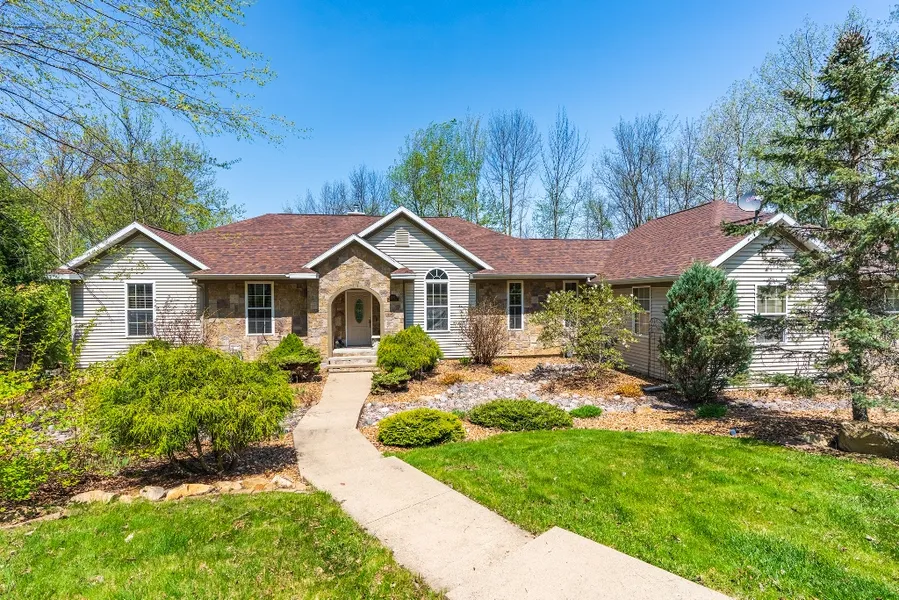 Welcome to this exquisite, meticulously maintained ranch home nestled in the highly sought-after neighborhood of Rib Mountain. Situated amidst an enclave of elegant residences, this home offers a sophisticated ambiance and a captivating curb appeal. Prepare to be impressed by the numerous recent updates, including a new roof in 2019, a new grinder ejection pit in 2019, and new patio doors in the basement in 2020. Other notable improvements include a new furnace board in 2020, a new driveway in 2020, high-end stainless steel appliances, new bedroom carpeting, and a new AC unit installed in the fall of 2022. Step into the foyer, where the grand floor-to-ceiling windows and rich red oak floors create an inviting atmosphere that will instantly make you feel at home. The 12-foot vaulted ceilings further enhance the spaciousness of the living area. Adjacent to the foyer, glass French doors lead to a versatile space that can serve as a formal dining room or a main floor office, allowing you to tailor the home to your specific needs. The living room exudes warmth with its magnificent stone gas fireplace and offers breathtaking views of Rib Mountain. The adjoining dining area seamlessly connects to the kitchen, where a generous island with granite countertops provides additional seating for casual meals. The kitchen is a chef's dream, boasting built-in double ovens and a striking 5-burner gas stove with a custom hood vent. The smart touch screen refrigerator adds a touch of modern convenience to the space. Completing the main level is a well-appointed full bath, a practical laundry/mudroom area, and a thoughtfully designed built-in desk space. The mudroom features a floor drain and custom hooks, making it easy to store and dry your winter gear after a day on the slopes. Continuing on the main level, you'll discover a second full bath and two bedrooms adorned with dimmable lighting and plush new carpeting. The spacious main floor master suite is a true sanctuary, offering a walk-in closet with built-ins and an ensuite bath that showcases marble-tiled flooring, a walk-in shower, and an indulgent jetted soaking tub. The lower level presents a welcoming family room complete with a second stone gas fireplace, a wet bar, and a convenient mini fridge. French doors open to a walk-out basement and a delightful stone patio, creating an ideal space for outdoor grilling and entertaining. The maintenance-free composite deck, accessed by a charming stone pathway, leads to the main floor entry. Adjacent to the family room is a generously proportioned office space featuring elegant tray ceilings. Down the hall, three more well-appointed bedrooms with double door closets and a full bath offer ample accommodations for family and guests. Throughout the home, solid six-panel oak doors add a touch of elegance. Don't miss your chance to experience the allure of this exceptional residence. Schedule your private showing today and seize the opportunity to make this remarkable home your own!