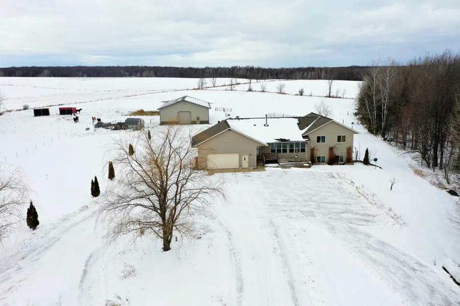 Spacious and move in ready 4 bedroom, 2.5 bath country home or hobby farm on +/-35 acres located just northwest of Athens. Large oak kitchen with an island, built in cooktop and double ovens. Dining room with patio doors to rear deck. Living room with wood burning fireplace. Entry/mud room with main floor laundry and a half bath. Master suite with double walk in closets and a full master bath. Mostly finished walk-out basement is plumbed for an additional bathroom and features a family/rec room with gas fireplace and a bedroom. Attached insulated garage. 45x64 Meyer shed with 2 finished rooms and plenty of storage. Diverse land with mixed woods, two creeks, pasture and a pond. The cooktop, double ovens, refrigerator, dishwasher, washer, dryer, water softener and lp tank are included in the sale price.