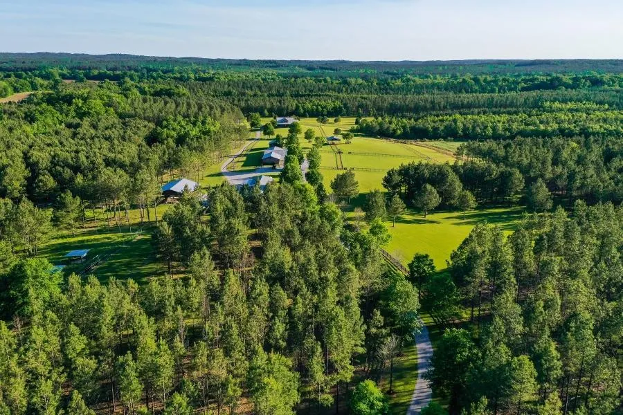 ** Structures: main house, guest lodge, equipment barn, and horse barn