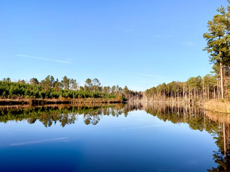 There are 2 lakes and 1 pond for fishing on the property. The largest is a little over 11 acres (per the owner), and there is a 1 acre pond and the other is about 4.5 acres. The owners had several thousand bull shad stocked this summer to feed the bass and bream. The large lake is just down the hill from the cabin, and has a pavilion for sitting and enjoying the peaceful surroundings. The large lake is long, with flooded timber in the back, and is likely to attract a few ducks in the winter. The owners have cleared the hillside around the lake, offering pretty views between the towering pines down to the water.