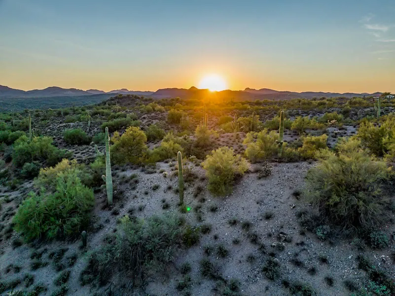 The Quiet Hills Ranch is in the Sonoran Desert, approximately 40 miles northwest of the Phoenix Metro Area. This beautiful desert property is comprised of long ridges with desert washes between them, sloping from northeast to southwest. There are numerous cactus species, including saguaro and cholla cactus along with scattered mesquites and palo verde trees. Presently there are no structures on this scenic ranch even though it is very much in the path of development.