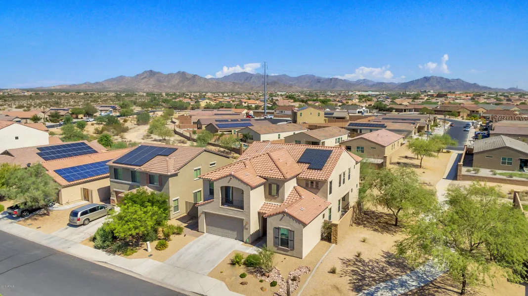 Beautiful meticulously well-kept home in desirable Watson Estates. Located directly across from community park, with only one neighbor to the west, this home is surrounded by walking paths and desert scenery. Backyard view fencing creates a perfect desert ambience along with paver firepit/sitting area and two separate patios. Eco-friendly with solar panels, backyard turf, LED lights, ceiling fans and blinds throughout the home. Kitchen features granite countertops, maple cabinets, custom backsplash, kitchen island, black appliances and walk-in pantry. Private guestroom and full bath downstairs, upgraded wooden banister, tile in all the right places. Plenty of living space-formal dining, formal living, family room, eat-in kitchen, loft, over-sized bedroooms, wide hallways, large closets.